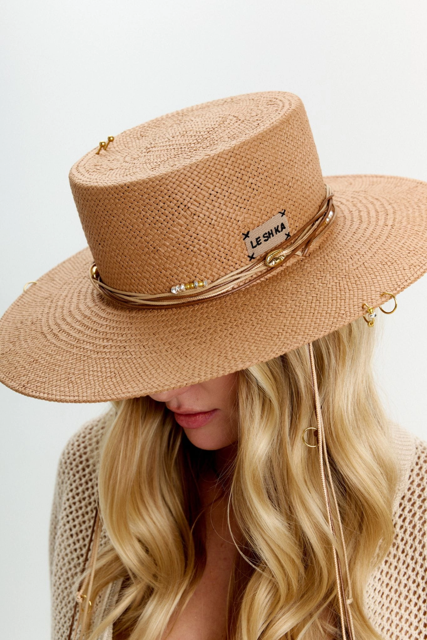 The Cappuccino Canotier model is made of the best quality Italian paper straw. The hat is decorated with string, shells and 24k gold-plated accessories.