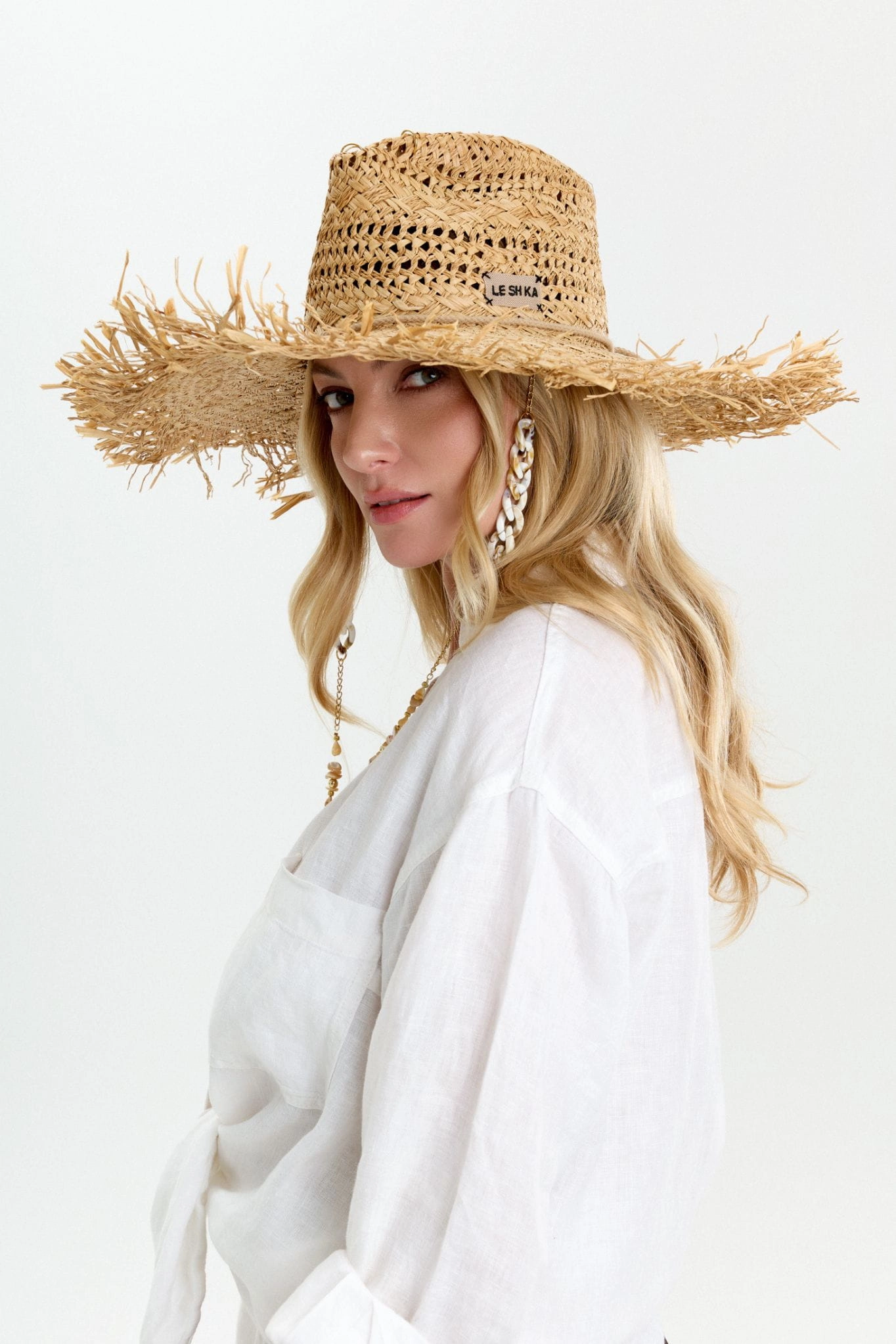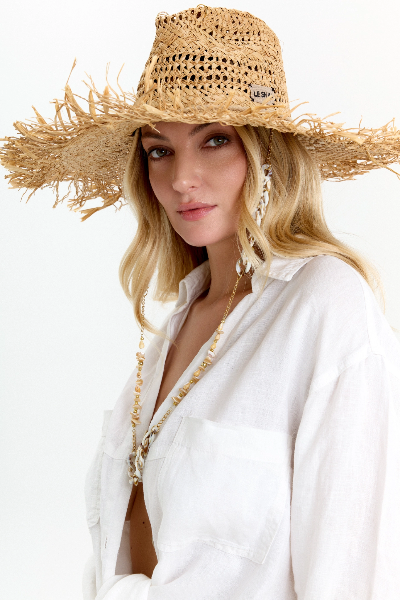 The Large Straw Fedora model is made of best quality natural straw. The hat is decorated with a string, shells and 24k gold-plated accessories.