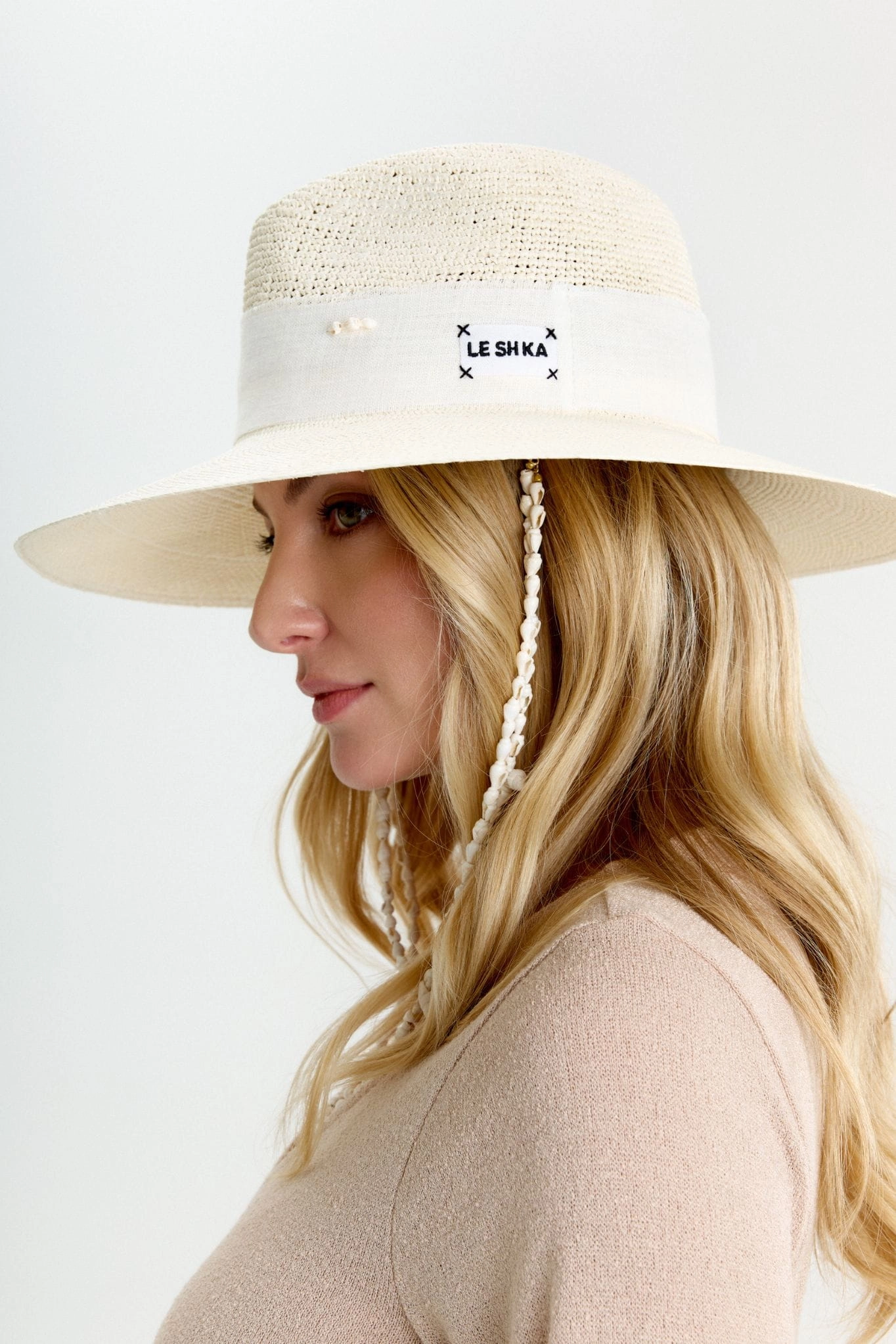 The White Seashell London is made of the best quality Ecuadorian panama, hand-decorated with linen ribbon and shells.